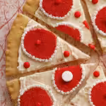 - Place a pearl dragee at the center of each wedge. Pipe a white border around the center red circle and add V-shaped beards between the smaller circles.